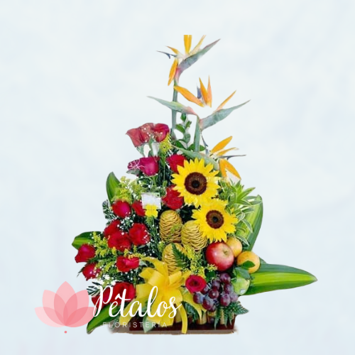 Arreglo Floral con Rosas, girasoles y aves del paraíso