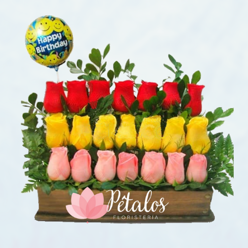 Haz que ese ser querido empiece el día de la mejor manera, envíale este colorido diseño floral, el cual se ha elaborado en una base de madera y se compone de 21 rosas en tonos rojo, amarillo y rosado. Incluye 1 Globo Metalizado de cumpleaños. Es ideal para cualquier ocasión. Sugerimos que acompañes este diseño con chocolates, peluches o vinos para hacer aún más especial tu detalle, en el siguiente paso de la compra puedes agregar a tu orden estos productos si lo deseas.