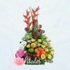 Para celebrar, compartir y disfrutar de este día de una manera original y muy especial, envía este bello diseño elaborado sobre una base de bambú o madera, se compone de 24 rosas en tonos rojo y amarillo, heliconias, follajes verdes y variedad de frutas frescas. El diseño incluye un oso de peluche. Sugerimos que acompañes este diseño con chocolates, peluches o vinos para hacer aún más especial tu detalle, en el siguiente paso de la compra puedes agregar a tu orden estos productos si lo deseas.