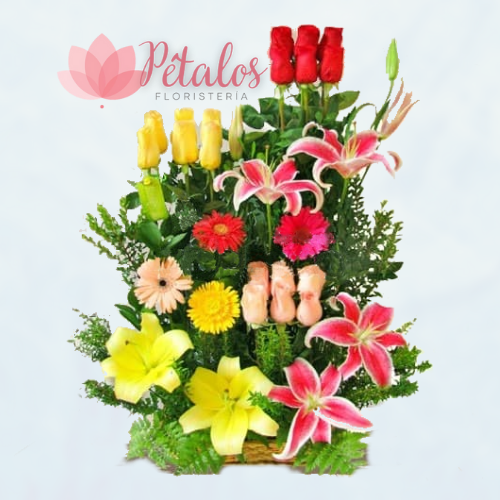 Las flores son la expresión más pura y el mejor canal por medio del cual puedes mostrar tus sentimientos, envía esta hermosa combinación de 18 rosas en tonos rojo, amarillo y rosado, junto con lirios, gerberas y follajes verdes. Está elaborado sobre una base de madera. Sugerimos que acompañes este diseño con chocolates, peluches o vinos para hacer aún más especial tu detalle, en el siguiente paso de la compra puedes agregar a tu orden estos productos si lo deseas.