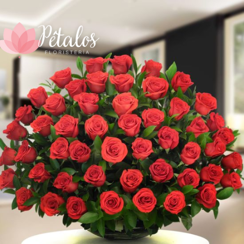 Este majestuoso diseño floral te permite demostrar tu gran amor, que más especial que este imponente diseño elaborado sobre una canasta o base de madera, que contiene 100 rosas rojas y follajes verdes. Sugerimos que acompañes este diseño con chocolates, peluches o vinos para hacer aún más especial tu detalle, en el siguiente paso de la compra puedes agregar a tu orden estos productos si lo deseas.