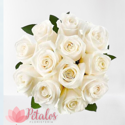 Alegra su día con un hermoso ramillete de rosas blancas con follaje verde, envuelto en plástico o papel y moño.
